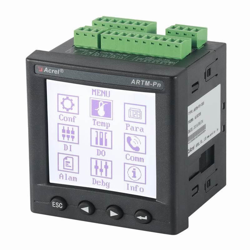 ARTM-Pn無線測溫裝置:ARTM-Pn無線測溫裝置可以單獨安裝在高壓柜、低壓抽屜柜內,每臺裝置可以接收18個傳感器的數據,傳感器型號可選配ATE100、ATE200、ATE300。裝置帶有一路485接口,可將采集到的溫度數據上傳到監控中心。